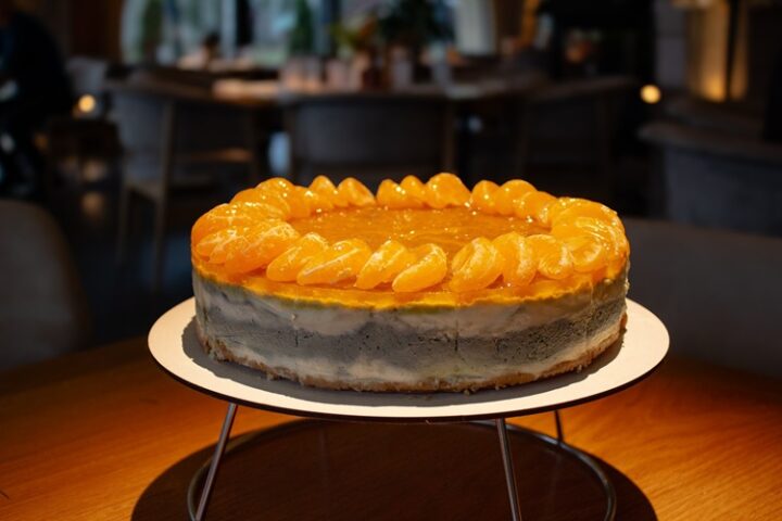 В основе чизкейка творожный сыр и густые сливки бренда «Углече Поле». Благодаря натуральной жирности и свежести продуктов, десерт обладает непревзойдённой сливочной глубиной и по-настоящему тающей консистенцией. Карамелизированные мандариновые дольки освежают насыщенную основу, а пудра зелёной матчи добавляет праздничный контраст.